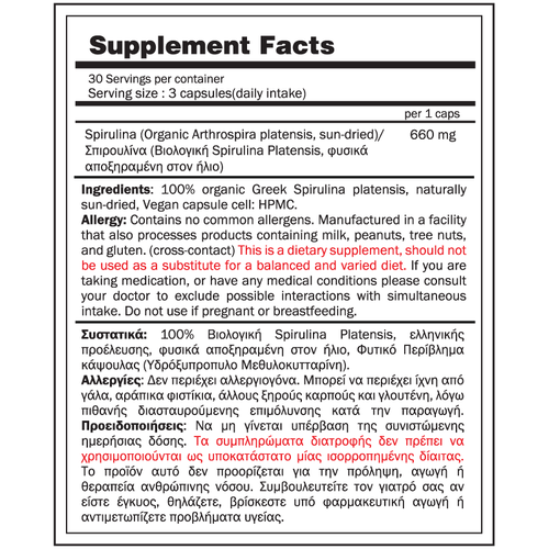 Υποστήριξη ανοσοποιητικού συστήματος: Χάρη στο β-καροτένιο, τη φυκοκυανίνη και τα φυσικά αντιοξειδωτικά που περιέχει, συμβάλλει στην προστασία των κυττάρων και ενισχύει το ανοσοποιητικό σύστημα, καθιστώντας το πιο ανθεκτικό στις λοιμώξεις.